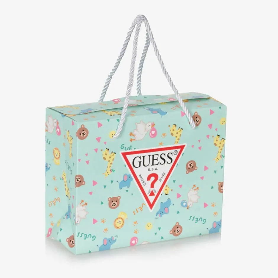In mint green and beige marl, this adorable babysuit set for boys and girls is by American brand Guess. It is made in soft cotton jersey, with logo branding and a cute and colourful animal friends theme. The bodyvests have envelope necklines and easy-fastening poppers between the legs. The bib secures with a popper behind the neck and the trousers have a gently elasticated waist. Complete with a pair of matching socks, the set comes with a coordinating gift bag, making it a lovely gift for a new arrival. This product contains organic cotton fibre.