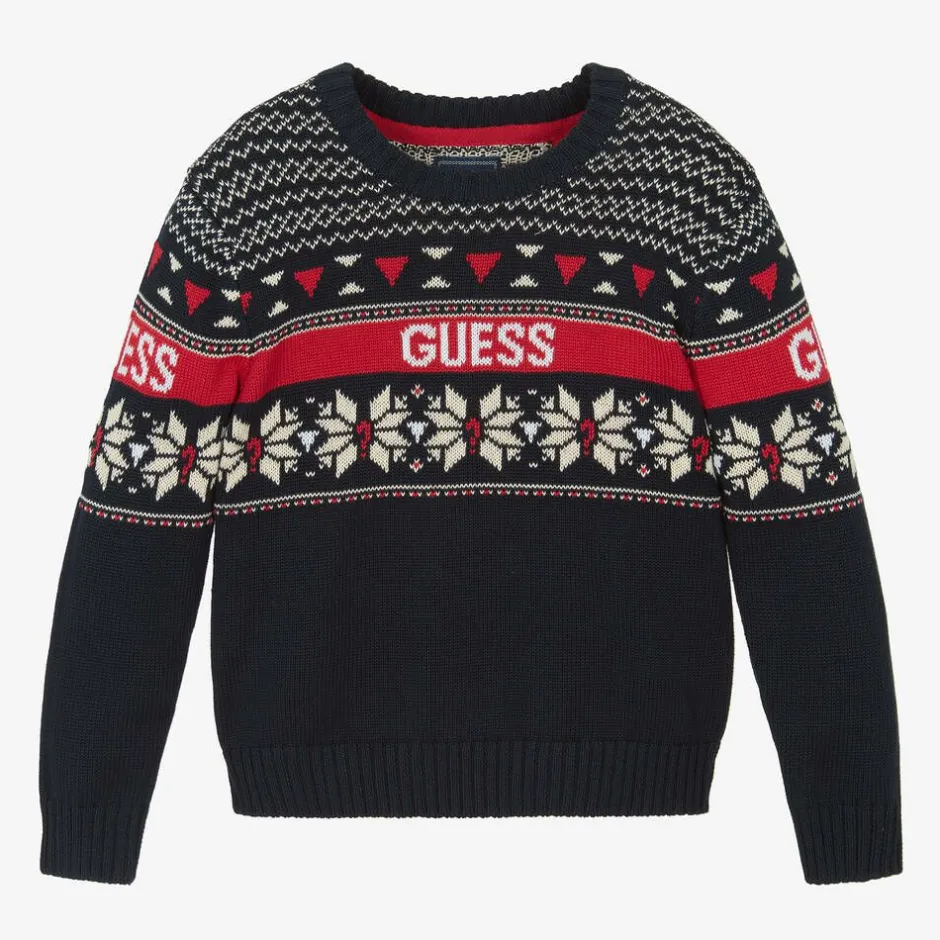 From Guess for younger boys, a lovely navy blue jumper. Knitted in soft cotton, it has a Fair Isle-style pattern which includes the brand's Triangle logo and name for brand recognition. This item contains organic cotton fibres.