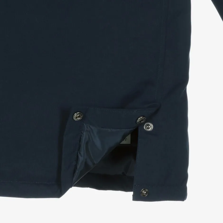 A classic navy blue parka coat for boys by Guess, with a beige faux fur trim and silky lining. Down-padded for extra warmth, this mid-weight coat has a hood that detaches with a zip for an alternative look. It fastens with a zip and poppers on the front, has useful flap pockets, and an iconic rubberised Triangle logo on one sleeve.