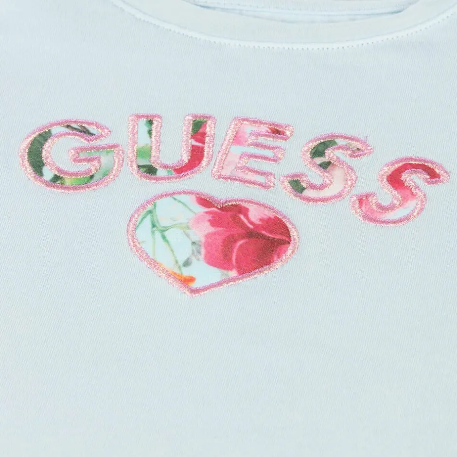 A pretty, pale blue cotton jersey long-sleeved top for younger girls by Guess. This longer-length top has a lovely chiffon peplum hem in a colourful floral print, which is appliquéd on the metallic pink logo embroidery on the chest. Contains organic cotton fibres.
