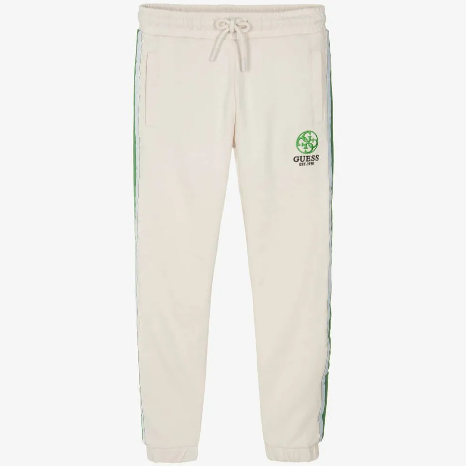 Ivory cotton joggers for girls by Guess, with smart green and white satin stripes down the legs. Made in soft, comfortable sweatshirt jersey, they have an elasticated, drawstring waist for a great fit and an embroidered 4g logo for brand identity.