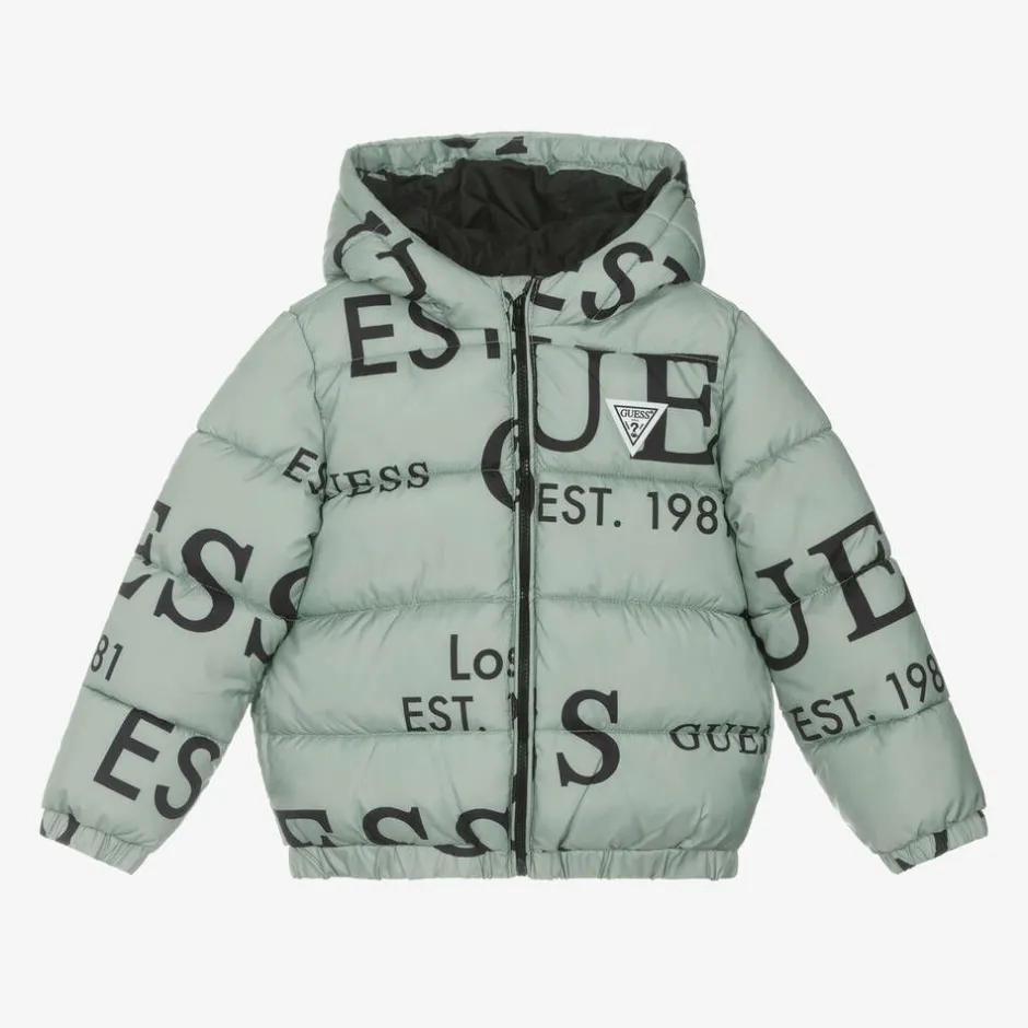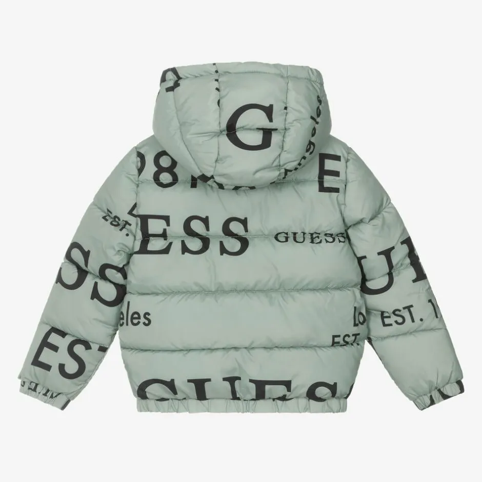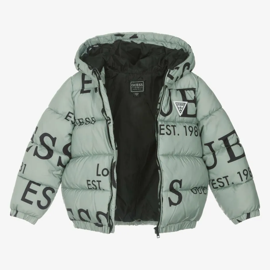 Cosy green puffer jacket for younger boys and girls from Guess, patterned with black logos for instant brand recognition. Made and lined in silky fabric, it is padded for added warmth and has a fixed hood to help protect your little one from the elements.