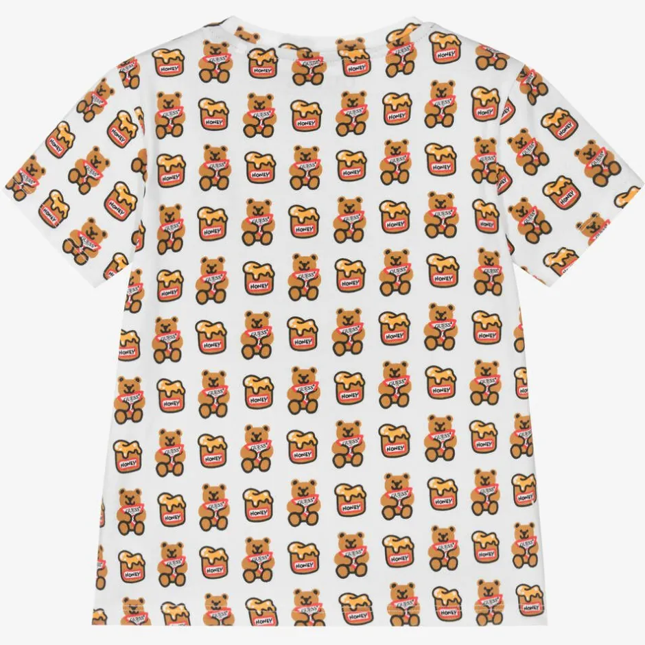 Fun ivory T-shirt for boys and girls from American brand Guess, made in soft cotton jersey. It has a cute brown bear print, with a large Triangle logo print on the front, for a bold branded look. It contains organic cotton fibre.