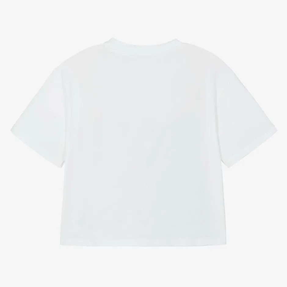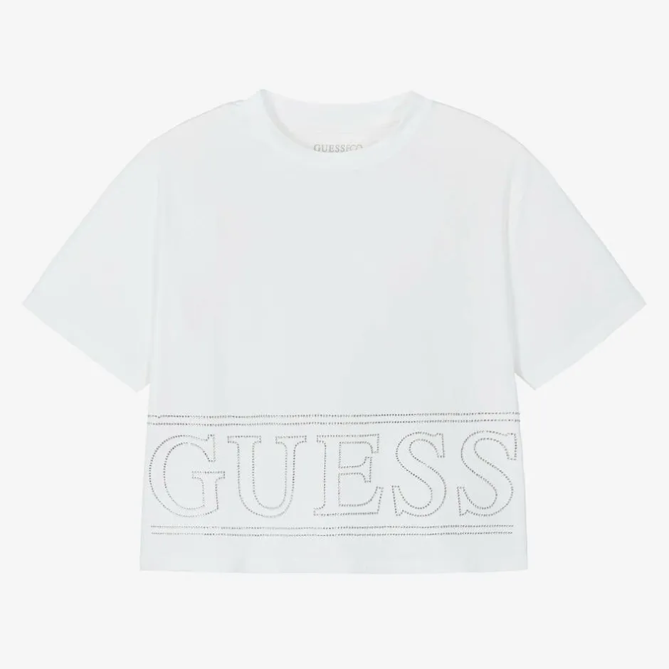 White cotton T-shirt for junior girls by American brand Guess, with a large diamanté logo on the front. Made in soft, comfortable jersey with short sleeves and a boxy fit, it is just right for adding a little sparkle to casual days. This item contains organic cotton fibres.