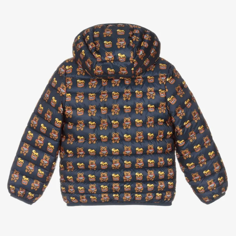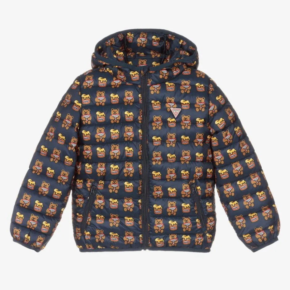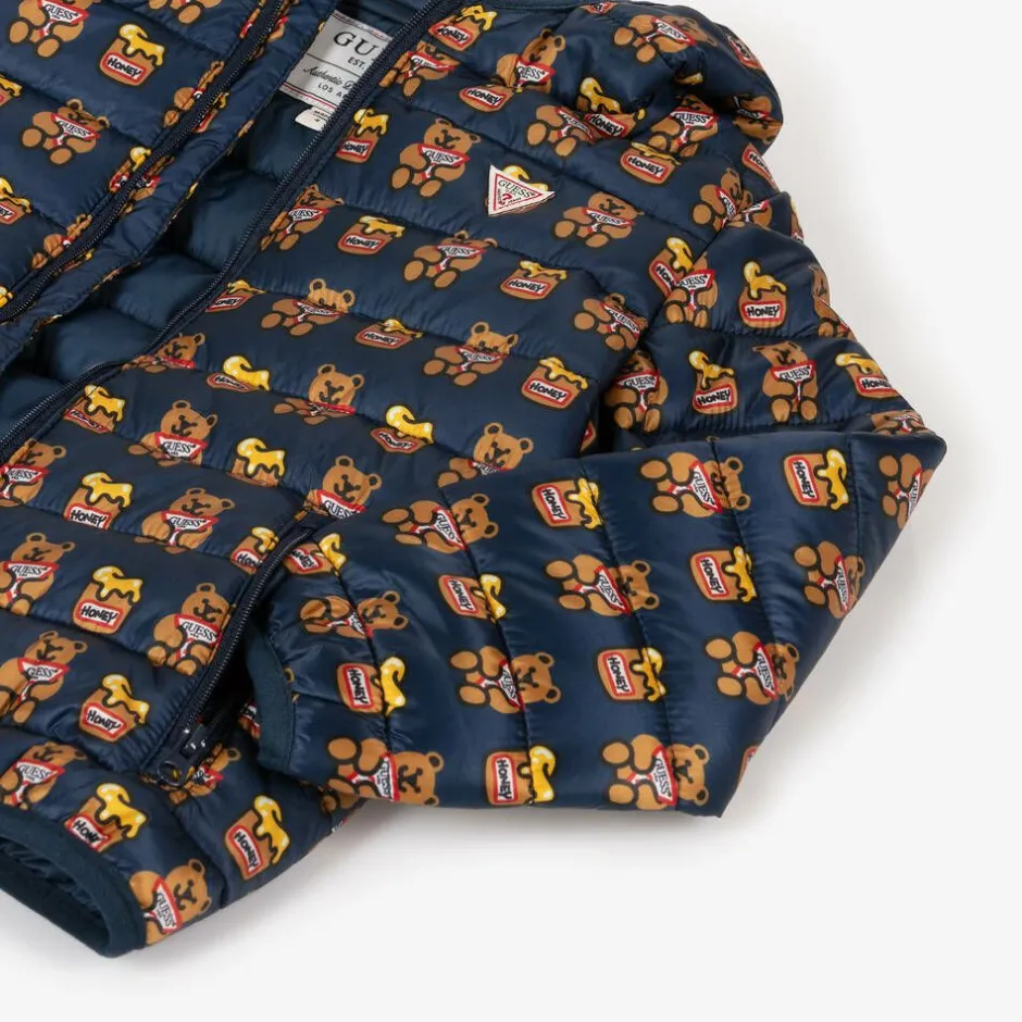 Navy blue zip-up puffer jacket for boys and girls by Guess, patterned with cute teddy bears, honeypots and logos. Made and lined in silky smooth fabric, this hooded jacket is lightly padded for warmth and has handy zipped front pockets. The elasticated trims on the cuffs and hemline help protect from cold chills. The iconic triangle logo patch is stitched on the chest for added designer appeal.