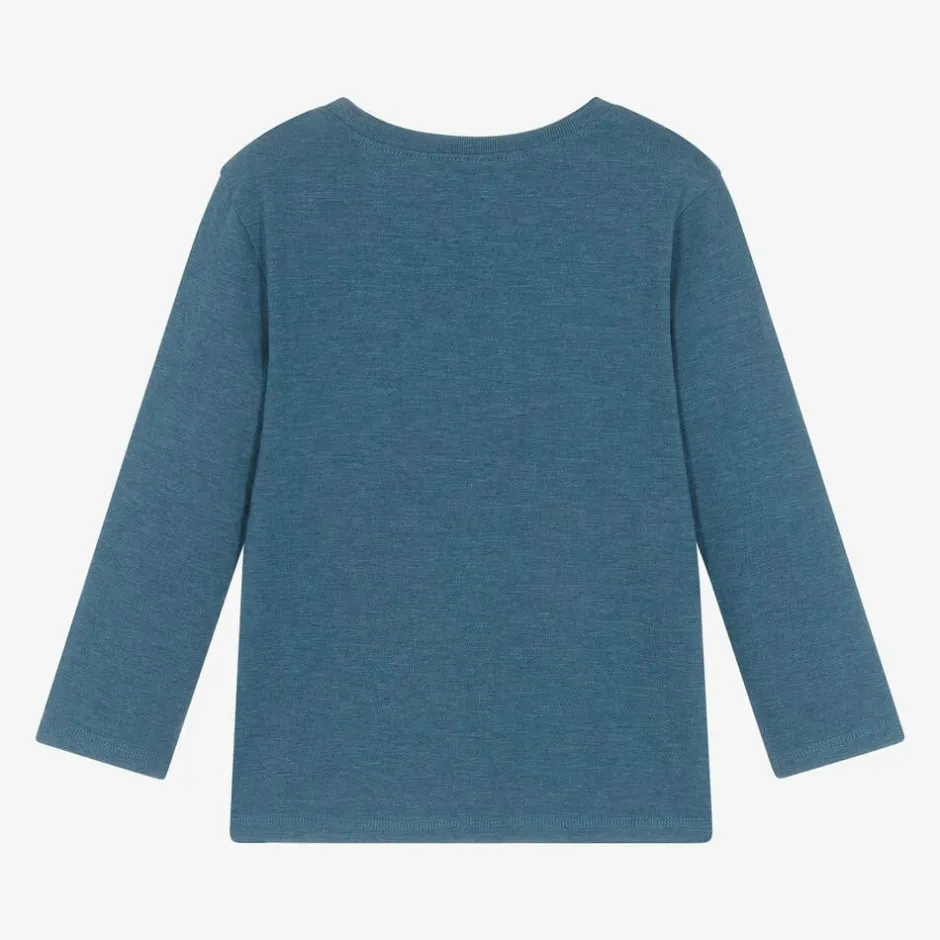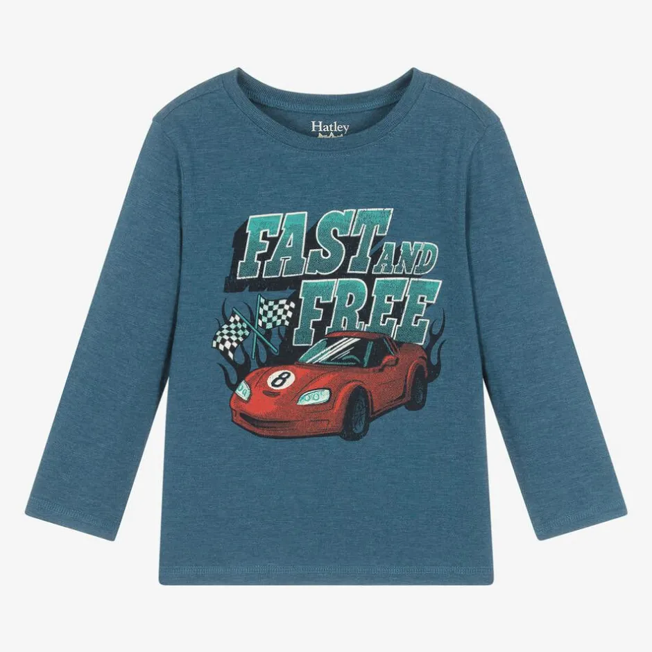Boys dark teal blue cotton blend top by Hatley, with a ribbed crew neckline and long sleeves. Made in soft and comfortable slub jersey, this casual top has a cool, 'Fast and Free' racing car graphic printed on the front in red.