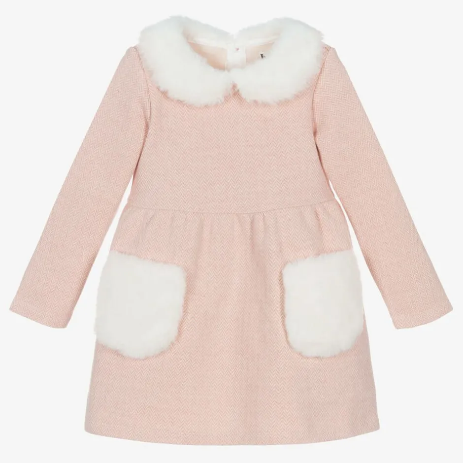 Lovely for little girls, this pink herringbone dress is by Canadian brand Hatley. It is made in soft mid-weight cotton jersey, with the Peter Pan collar and front pockets in white plush faux fur. The waist is gently gathered and there are button fastenings on the back.