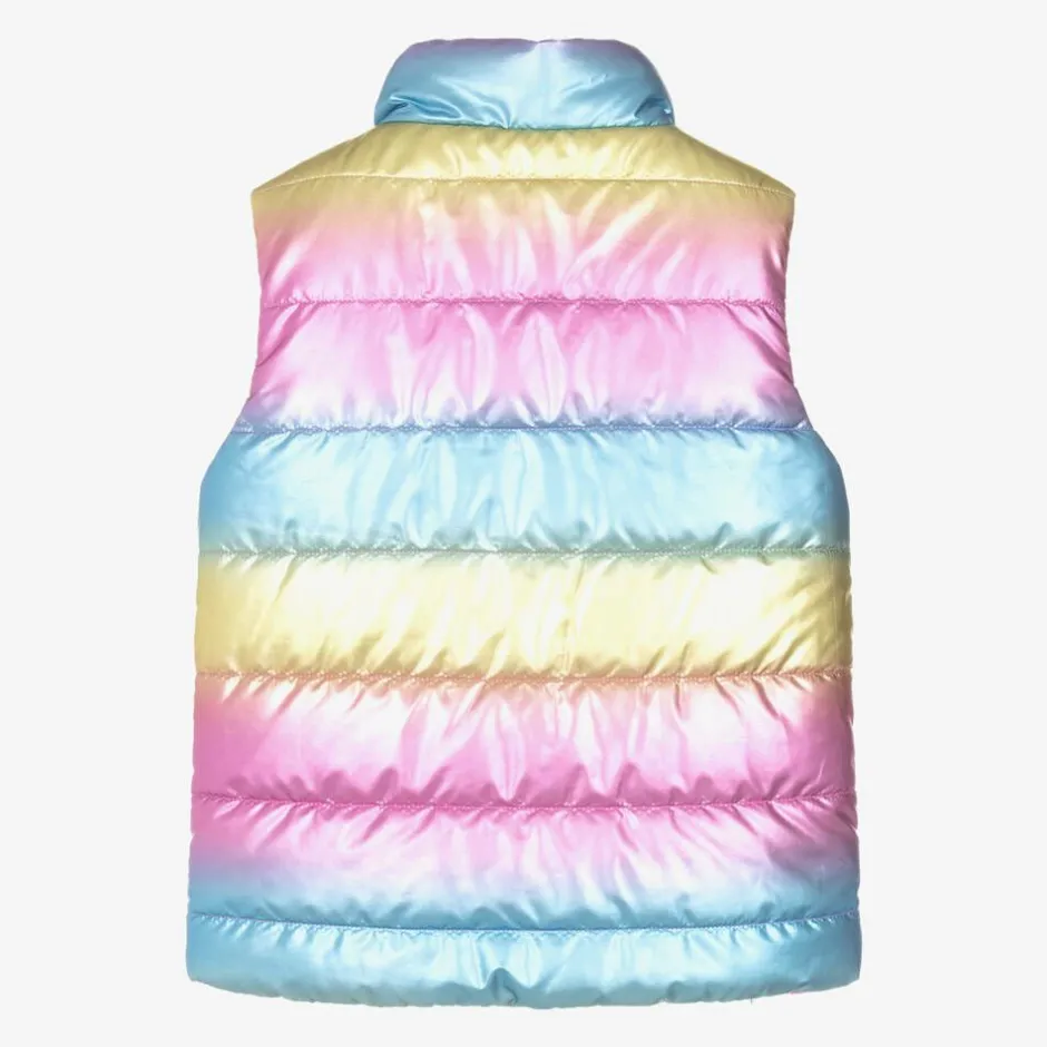 A fun and eye-catching reversible puffer gilet for girls by Canadian brand, Hatley. One side is in metallic rainbow ombré colours and the reverse side is glossy pink with a cool lightning bolt appliqué on the back. Smooth and lightly padded, this vibrant layering piece has pockets on both sides and fastens with a chunky silver zip.