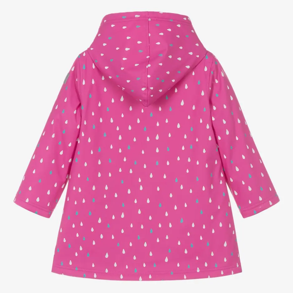 Lovely magenta pink raincoat for girls by Hatley, patterned with a sweet blue and white raindrop print that changes colour in the rain. Ideal for rainy days, it has a water repellent coating and is lined in soft sherpa fleece for cosy warmth. There are reflective logo badges on one sleeve and near the hem for improved visibility. This practical coat fastens with bright blue poppers on the front and on the pockets.