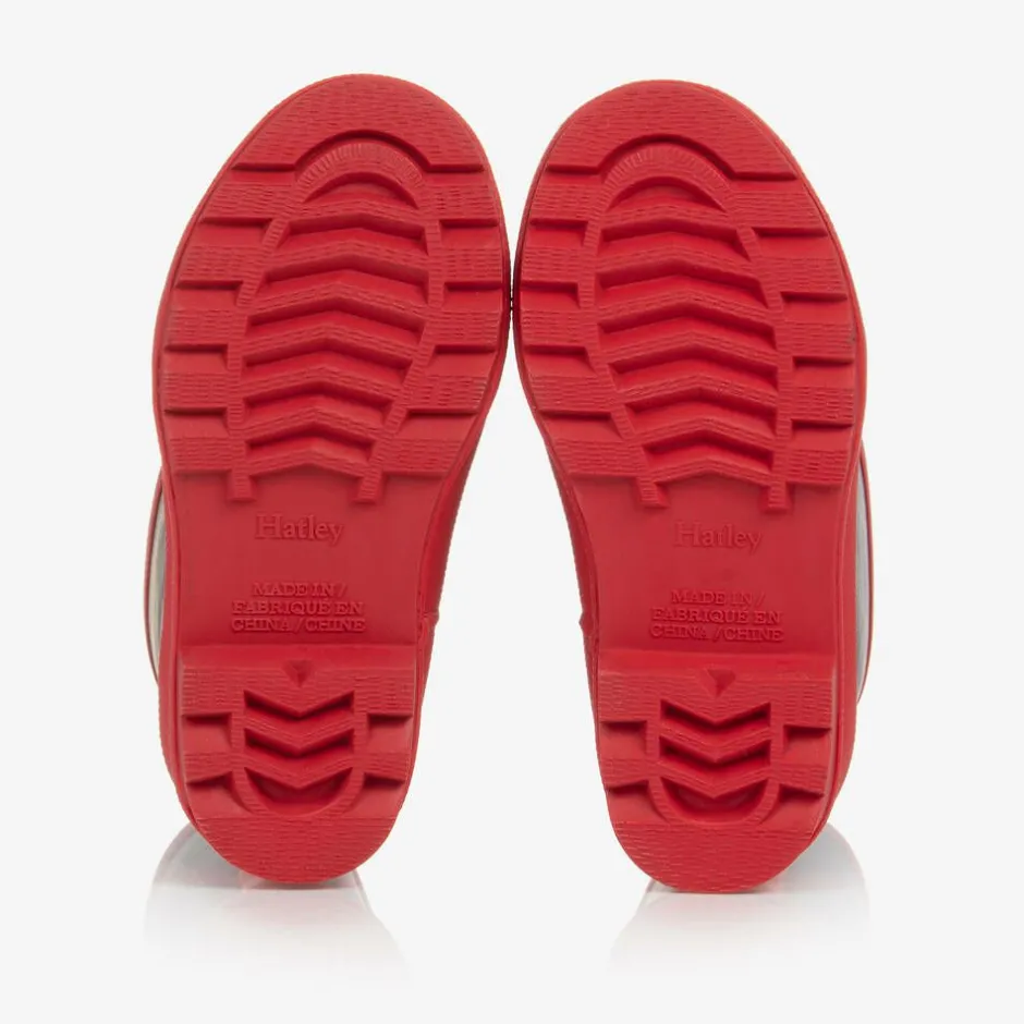 Navy blue and red matte rain boots for boys and girls by Hatley, made from PVC-free rubber. Lined in soft cotton, they are designed with slip-resistant outer soles and removable insoles. They have a light-reflective logo patch on the front for improved visibility and a pull-tab on the back to help with dressing.