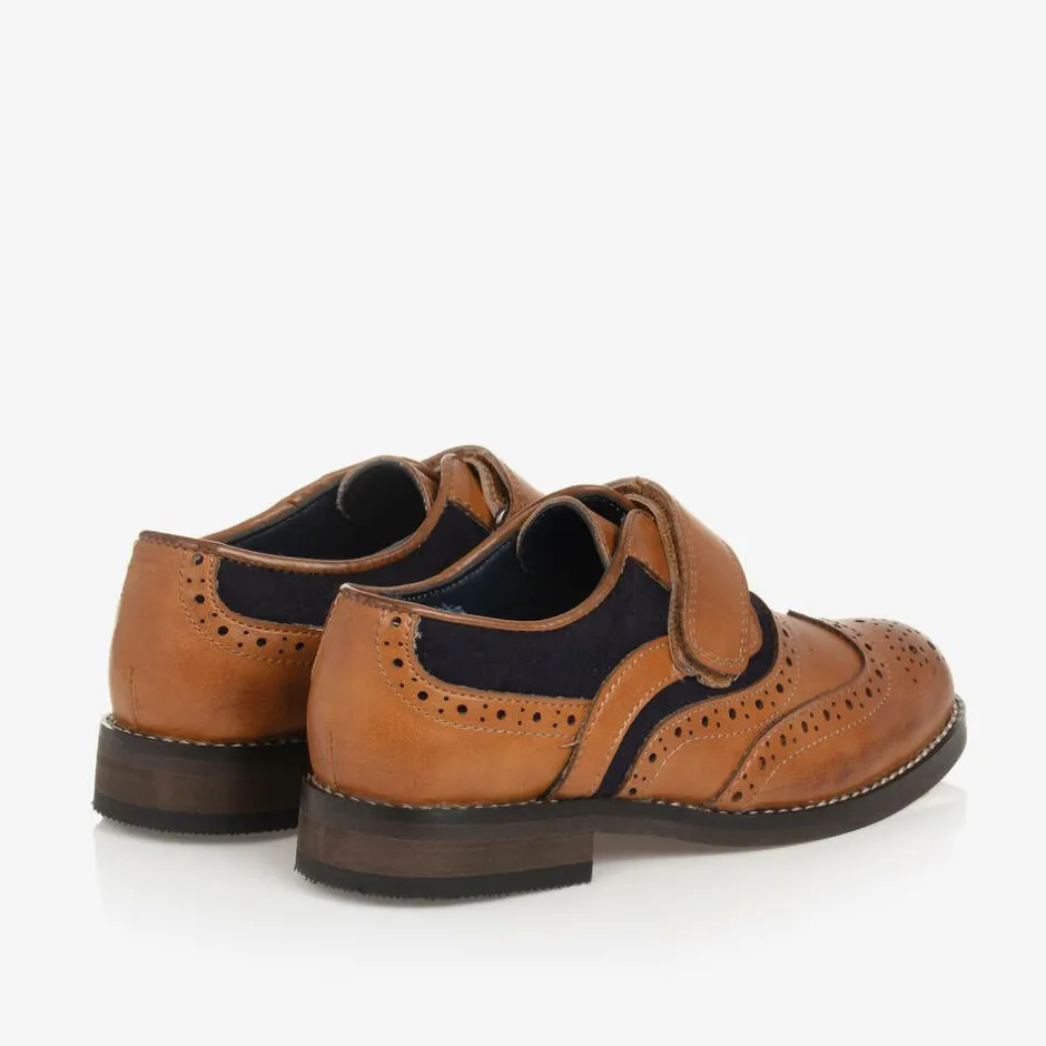 Inspired by the main collection, these tan brown brogues for boys are by House of Cavani. Made and lined in smooth faux leather, they have navy blue faux suede trims and practical velcro straps across the front. Smart and stylish, they have perforated detailing, a lightly padded insole for added comfort, and slim rubber outsoles for a sleek finish.