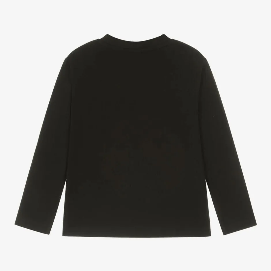 A black top for boys by HUGO, made in soft organic cotton jersey. This casual top is simply styled with a crew neck and long sleeves. The designer's name is displayed boldly on the front in red print for instant brand recognition.