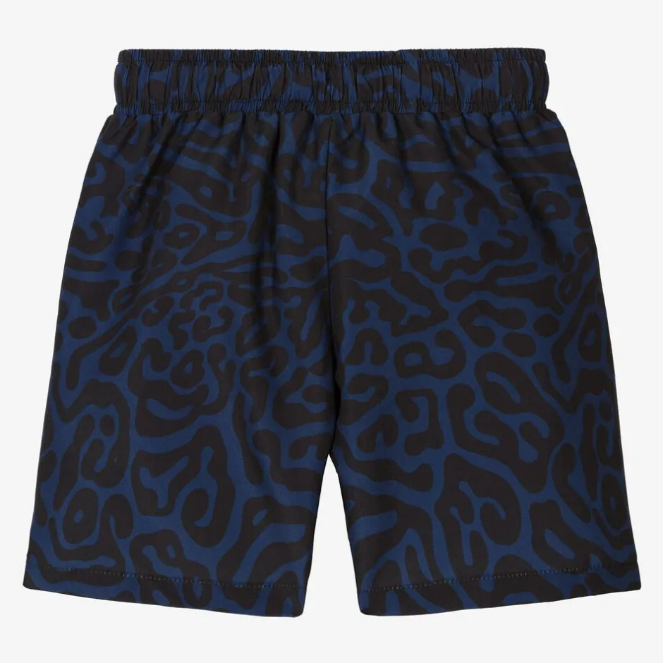 Blue swim shorts for boys by HUGO, with a black animal print pattern. Silky smooth and lightweight, they have a comfortable mesh lining and front pockets. The stretchy, drawstring waist has branded silverware and the designer's signature red and black logo patch is stamped on one leg for a statement finish.