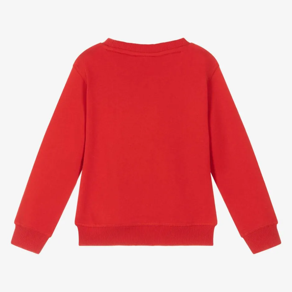 Cool and casual red crew neck sweatshirt for boys by German label HUGO. Comfortable and easy to wear, it is made in cotton-blend jersey with a soft and fleecy inside. The brand's signature logo stands out in black and red on the front.
