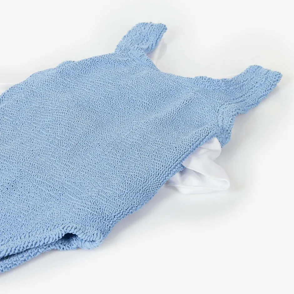 A signature swimsuit for younger girls by the iconic swimwear brand Hunza G, in a lovely cornflower blue colourway. Made in the brand's super-stretchy Original Crinkle fabric, it is designed to fit your little one for years to come. This stylish one-piece has a silky white frill across the back, with matching cross-over shoulder straps, centred by a decorative bow for a pretty finish.