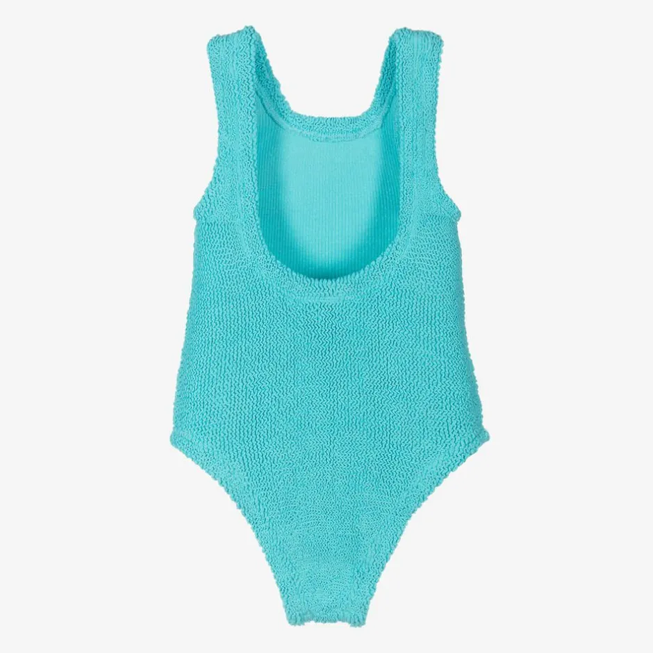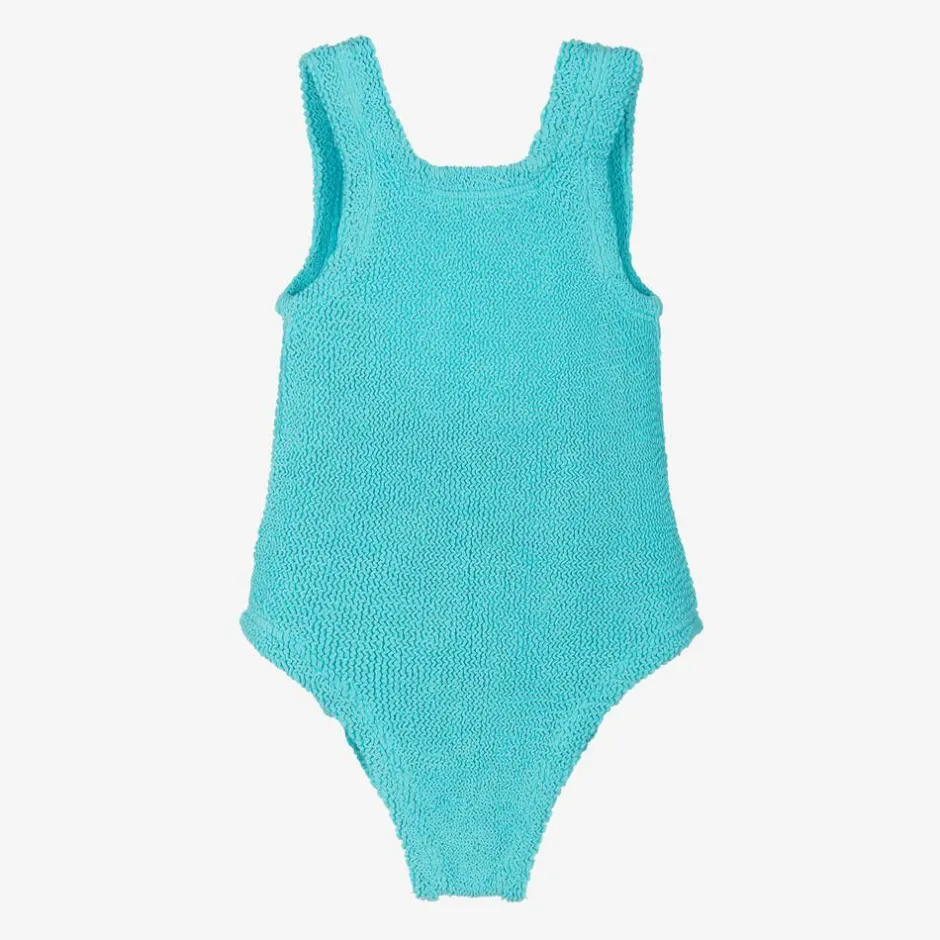 This aqua blue swimsuit for girls by British fashion label Hunza G is a cute Mini-me style. Designed to fit for years to come, it is made in the brand's signature Original Crinkle fabric with super-stretchy qualities. The stylish, simple design is complete with a scooped back detail.