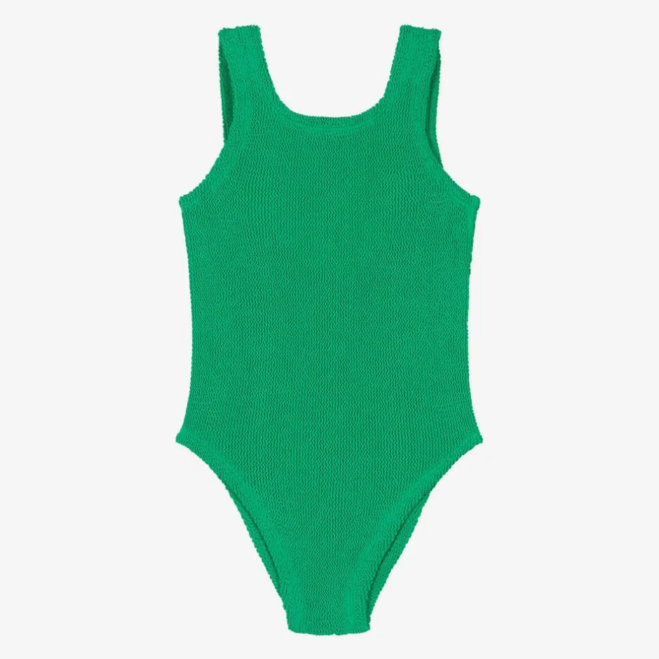 A classic emerald green swimsuit for older girls by Hunza G, made in the British brand's iconic Original Crinkle Fabric. This comfortable and timeless beachwear one-piece is styled with a scooped back. For lasting wear, the material offers effortless stretch, allowing the swimsuit to grow with your child.