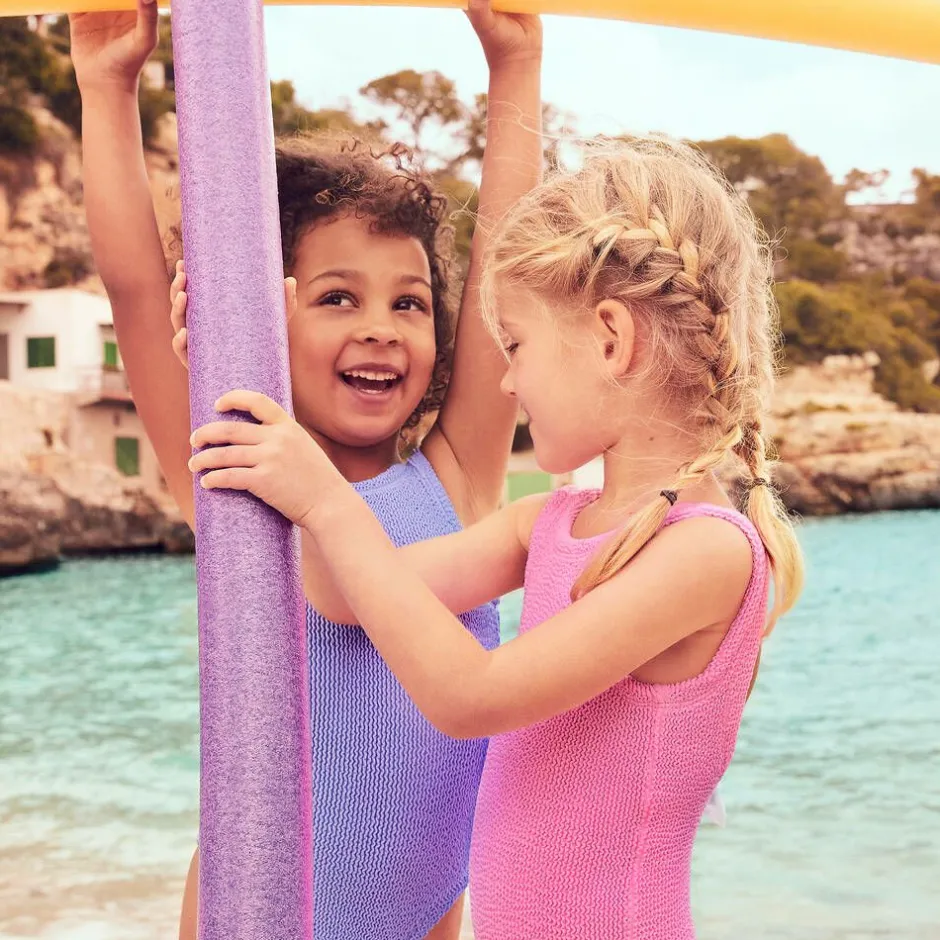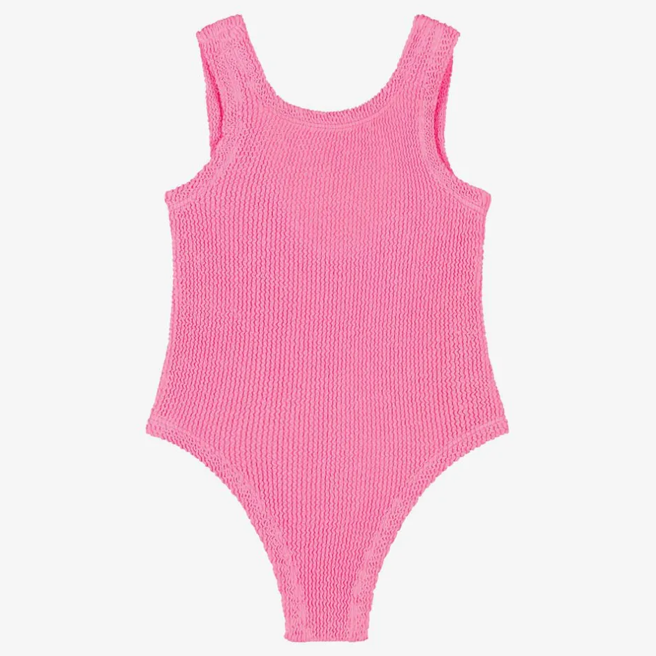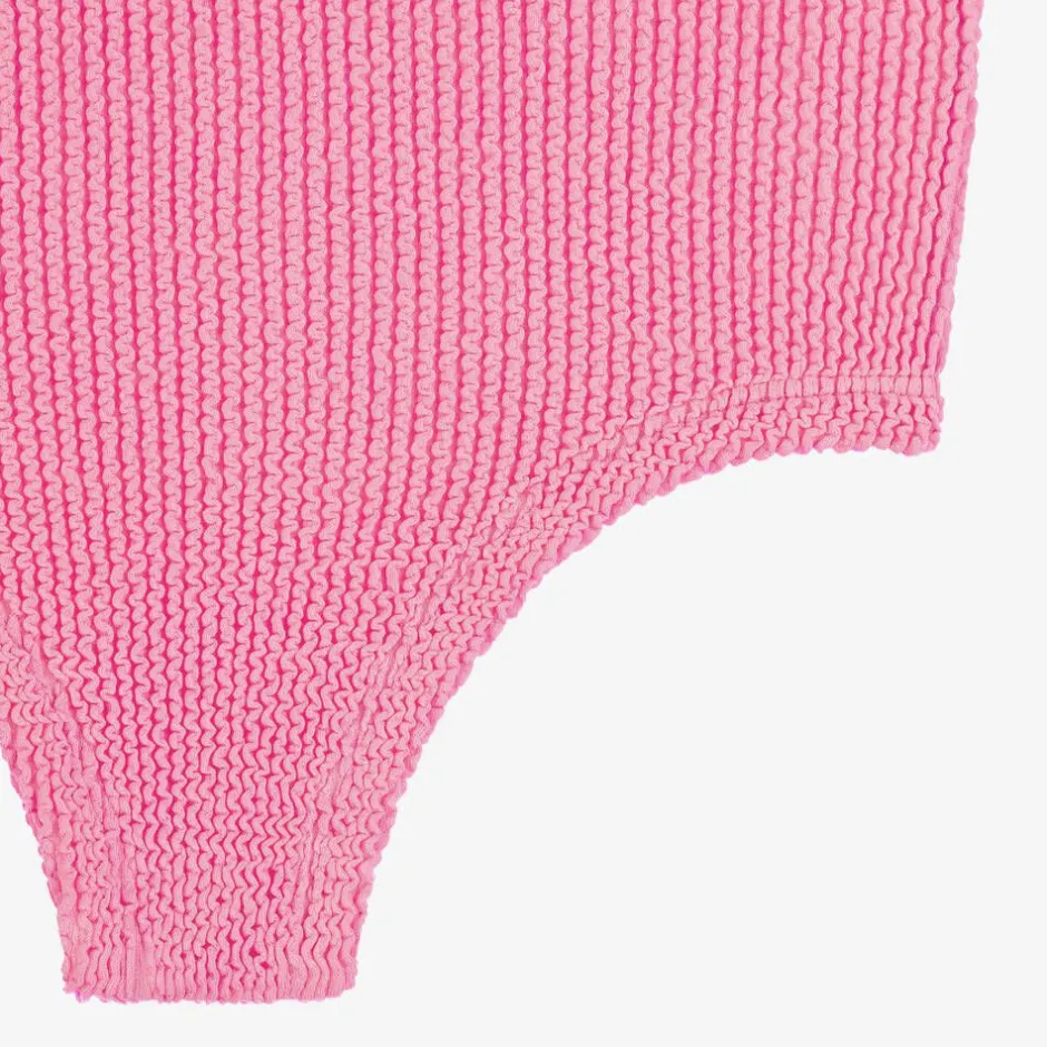 Adorable bright pink swimsuit for girls by British brand Hunza G, in the iconic Original Crinkle fabric inspired by the adult collection. For timeless beachwear styling, this one-piece has a square neckline and a scooped back decorated with a white bow. The material offers effortless stretch so that the swimsuit fits your child as they get older.