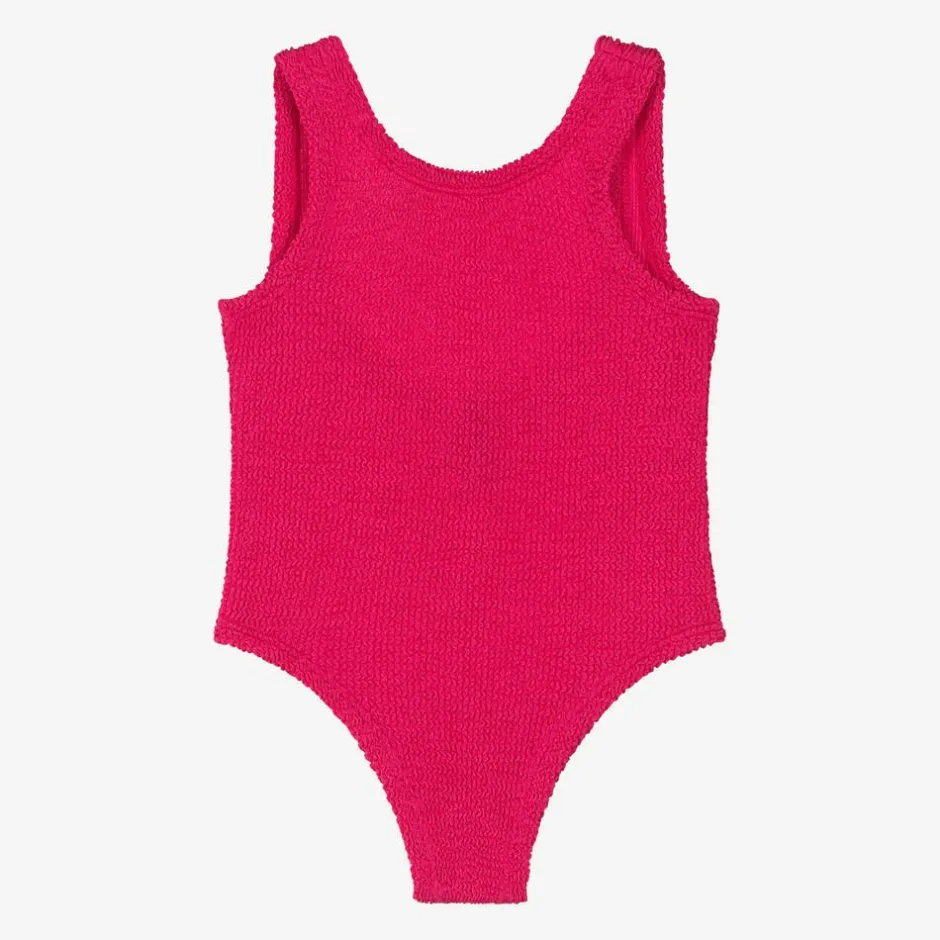An eye-catching, fuchsia pink swimsuit for girls by Hunza G, in the British brand's iconic Original Crinkle fabric. A timeless beachwear style, this one piece has a scooped back decorated with a white bow appliqué. For lasting wear, the material offers effortless stretch, allowing the swimsuit to grow with your child.
