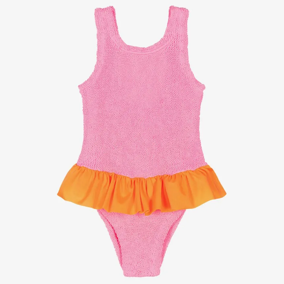 A scooped-back swimsuit for girls from luxury brand Hunza G, in bright pink with a neon orange frill. This stylish swimsuit offers lasting comfort thanks to its Original Crinkle fabric, a super-stretchy material signature to Hunza G.