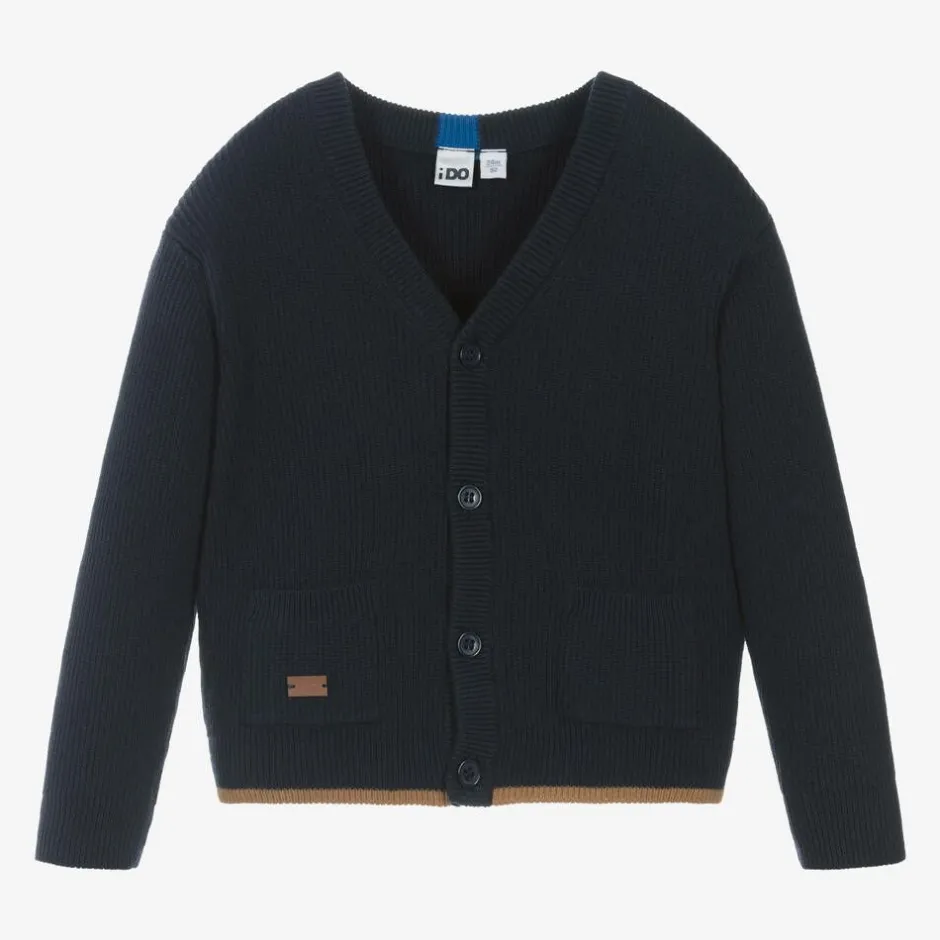 Navy blue cardigan for boys by iDO Baby, knitted in a ribbed cotton blend. Trimmed with tan brown piping, this layering piece has pockets on the front and simply fastens with buttons. A small logo badge completes the look with a subtle touch of branding.