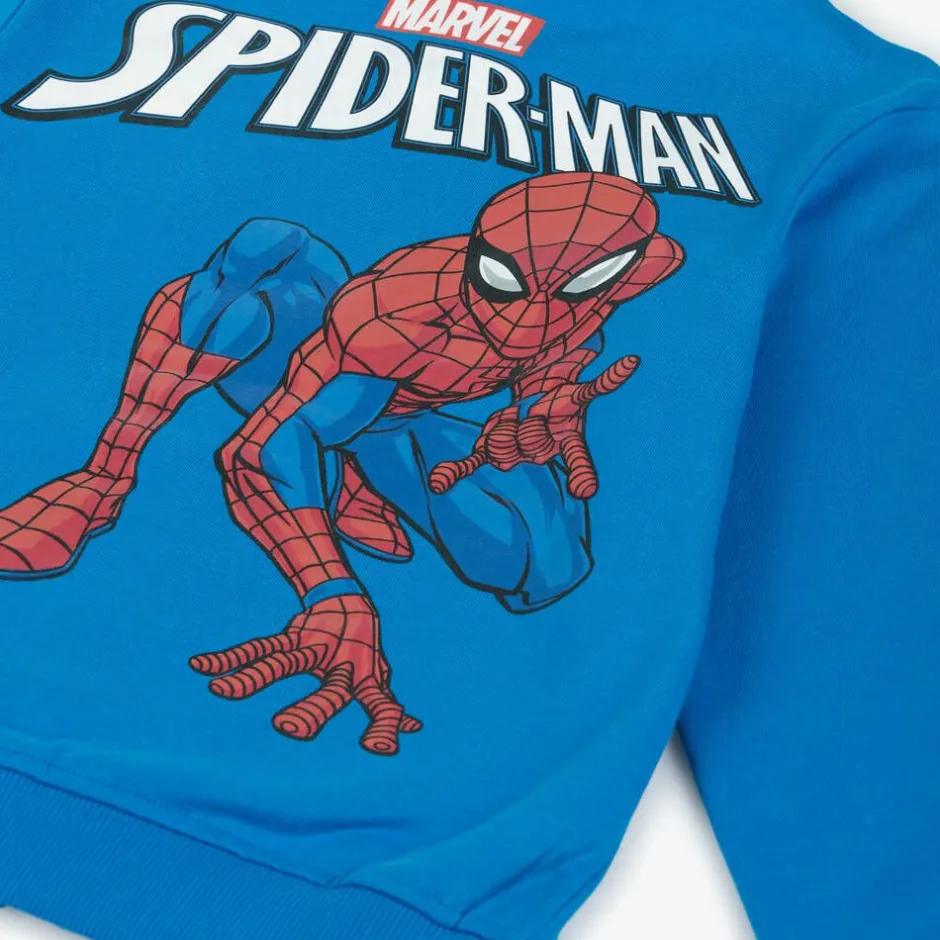 Bright blue zip-up top for boys by iDO Baby, made in mid-weight cotton jersey with ribbed trims. Fleecy on the inside, this hooded top has a full-sized Spiderman print on the back from the well-known Marvel comics. There is a character appliqué on the chest, encircled by Spiderman's famous proverb.
