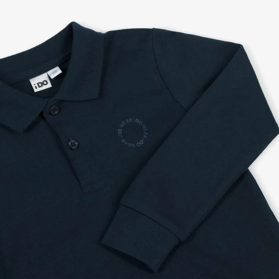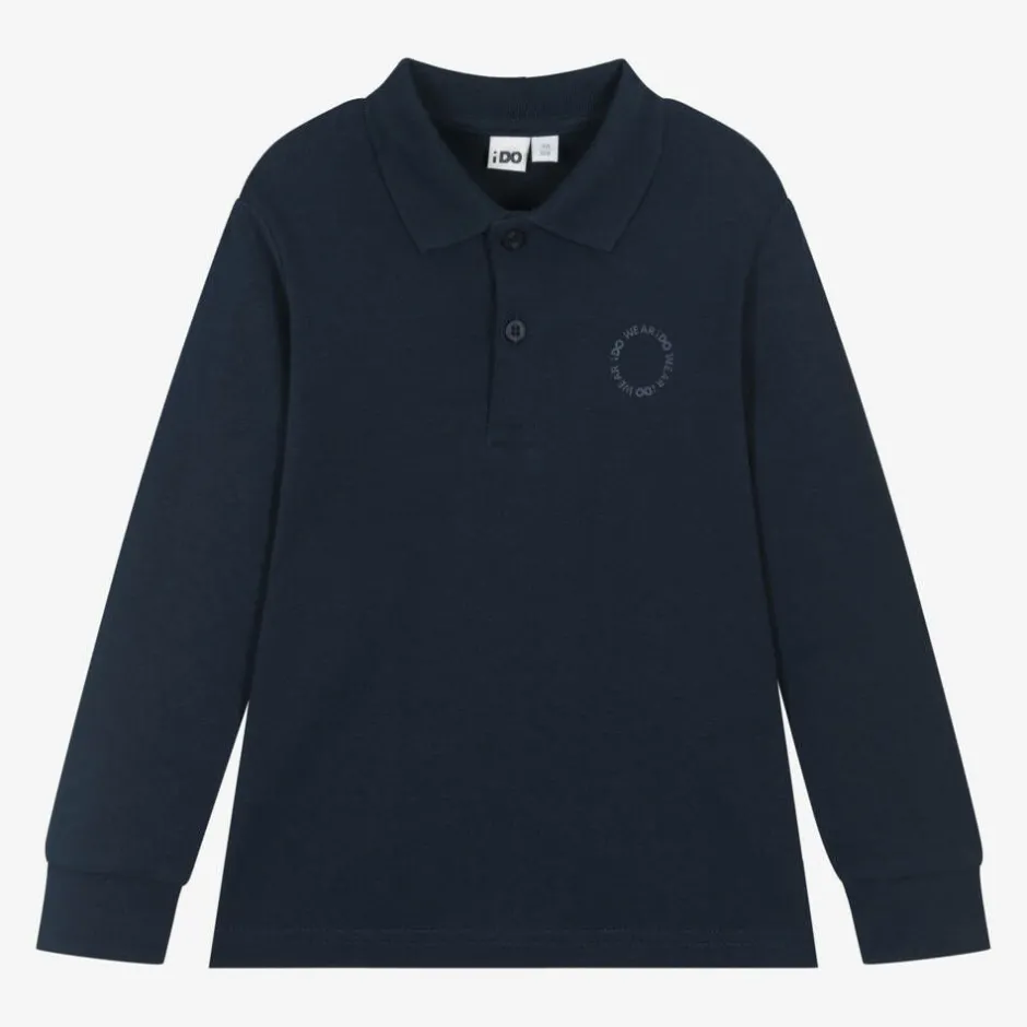 Casual navy blue rugby shirt for boys by Italian brand iDO Baby, made in soft cotton jersey. This wardrobe staple has ribbed cuffs on the long sleeves and a hemline that is longer around the back than the front. A tonal slogan on the chest and branded button fastenings on the front add a subtle designer finish.