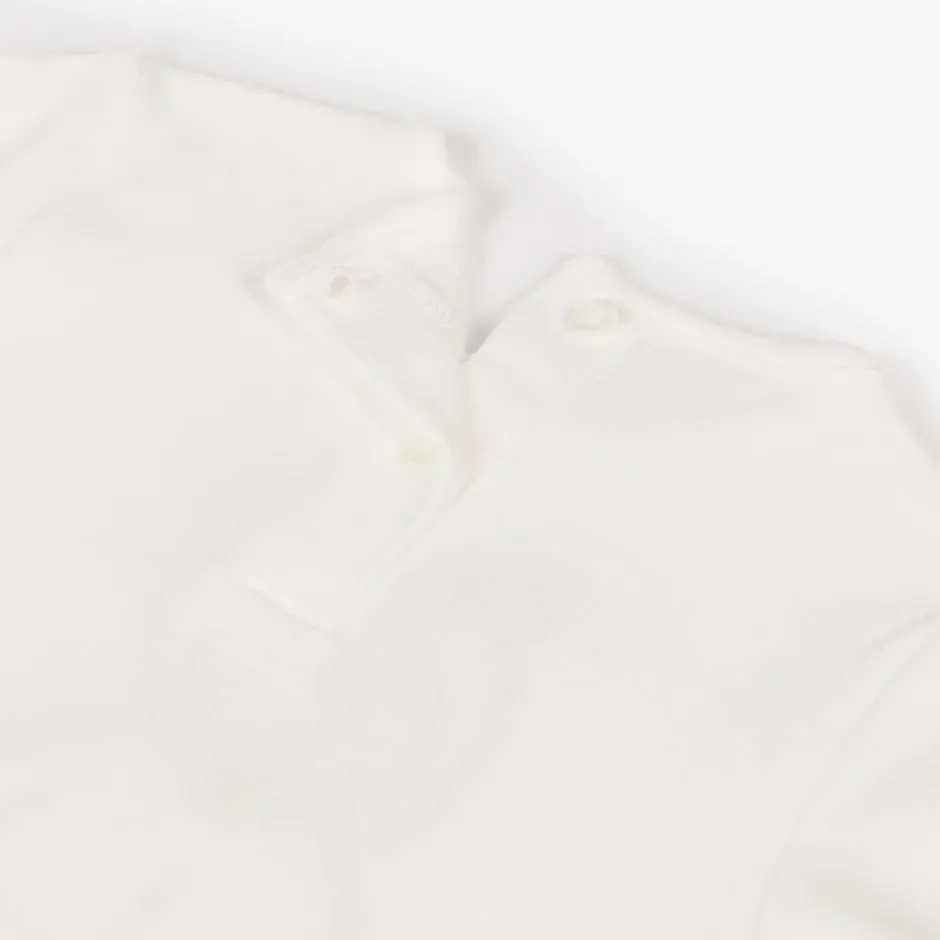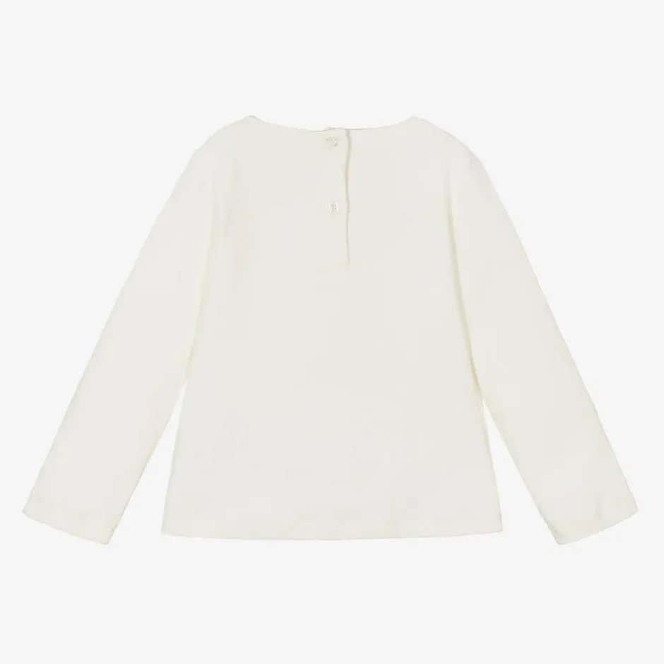 An ivory cotton top for girls by Italian designer iDO Baby. A sweet little girl holding her teddy bear is printed on the front, wearing a fluffy fleece jacket appliqué with a faux button and sparkly diamanté tights. It is made in soft jersey and fastens with buttons on the back.