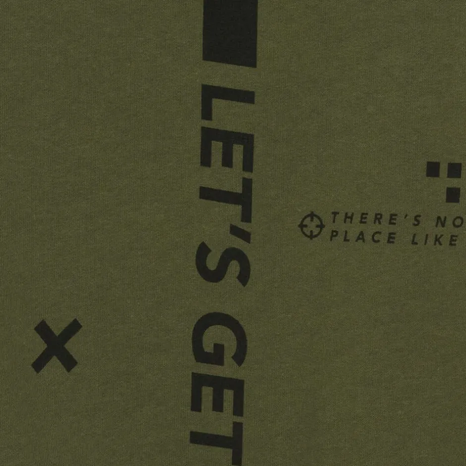 A khaki green tracksuit for older boys by iDO Junior, made from soft mid-weight cotton jersey with a cosy fleecy interior. Great for an adventurous look, the long-sleeved hoodie is printed with neon yellow slogans on the front and a black 'let's get lost' catchphrase design on the back. Complete with a pouch pocket on the front, it has contrasting black detailing for a cool look. The coordinating joggers have slanted pockets, a patch pocket on one leg, and an elasticated drawstring waist for a comfortable fit.