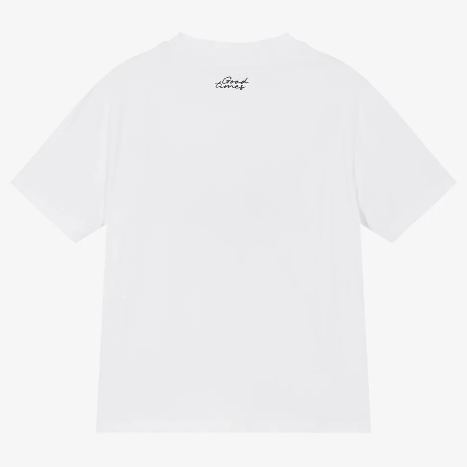 Casual white T-shirt for older boys by iDO Junior, made in soft cotton jersey. It has a 'simply cool' slogan printed across the chest and 'good times' printed on the back of the neck for a cool, graphic look.