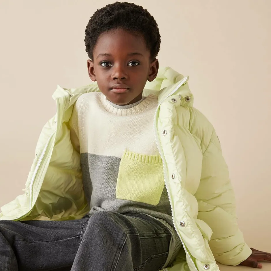 Boys long-sleeved sweater by luxury Italian brand Il Gufo, with an ivory and grey colourblock design. Ideal for colder days, it is knitted in soft organic cotton. It has chunky ribbed trims for an extra cosy feel, with a pastel green chest pocket and cuff adding a cool, contrasting look.