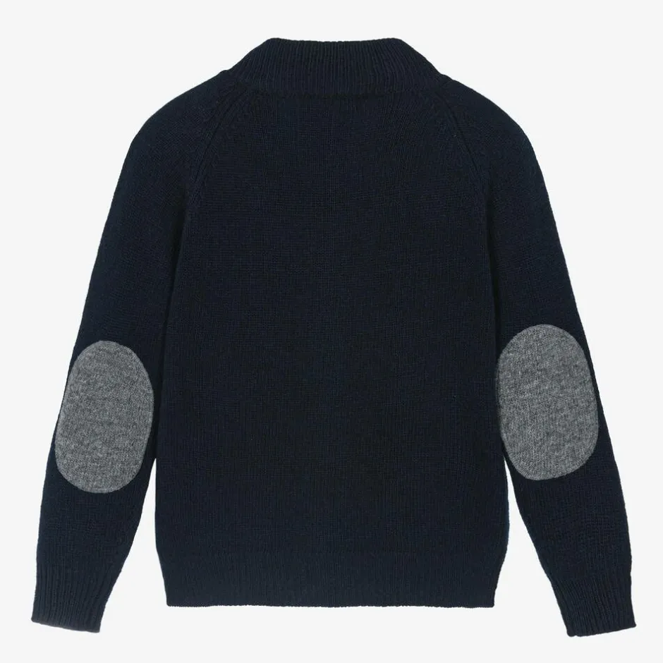 Stylish navy blue cardigan for boys by luxury Italian brand Il Gufo. Knitted in super soft virgin wool, this warm layering piece has a high neckline, contrast grey elbow patches and ribbed trims. The front zip fastening has a logo-engraved pull for a subtly branded finish.