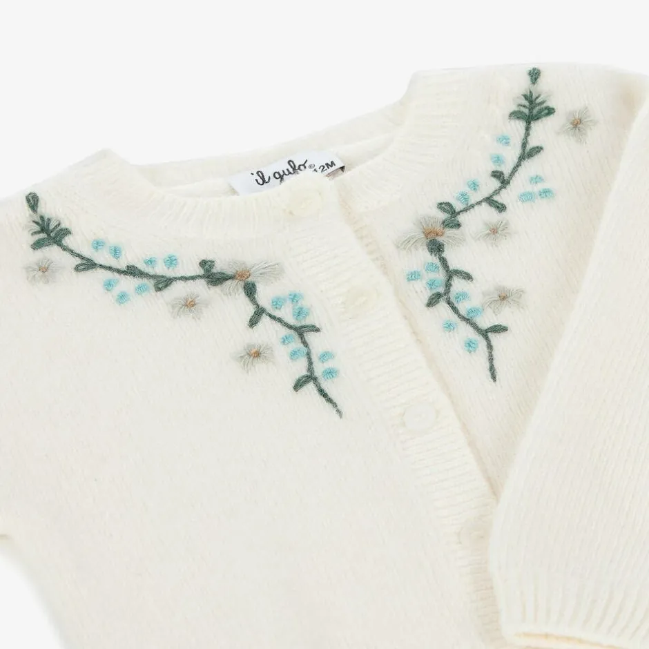 Beautifully hand-embroidered with a floral design in green, beige and blue, this ivory cardigan for little girls is from luxury Italian brand, Il Gufo. A classic crew neck design, it is softly knitted in wool for a gentle yet cosy feel against the skin. Adding a designer touch, the button fastenings are patterned with logos and there is an embroidered grey logo above the front hem.