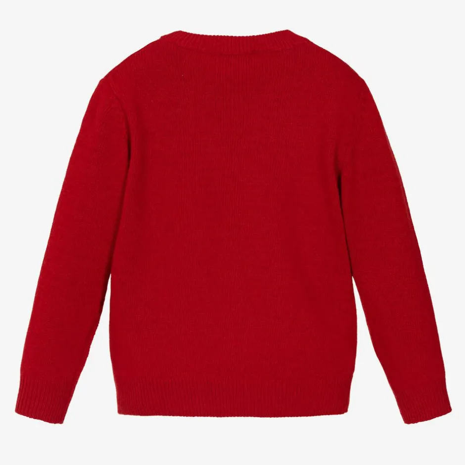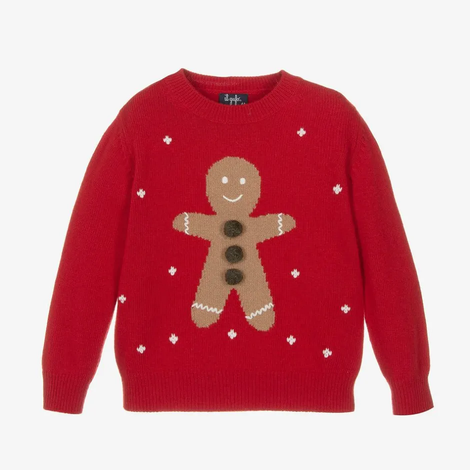 Cosy red sweater for boys and girls by luxury Italian brand Il Gufo, lovely for the festive season. Knitted in luxuriously soft, virgin Merino wool, it has an intarsia gingerbread man on the front, trimmed with fluffy pom-poms and surrounded by little white snowflakes.