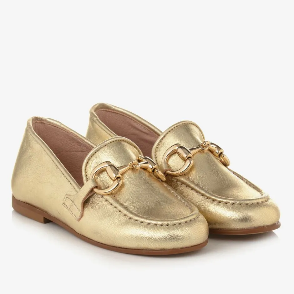 Stylish gold loafers for girls by Spanish brand Irpa, made in luxuriously soft and supple leather. The shiny gold tone horse-bit detailing adds a sophisticated look to these classic slip-ons. Great for a smart casual occasion and comfortable for everyday wear, they have a soft faux leather lining and a sleek beige sole.