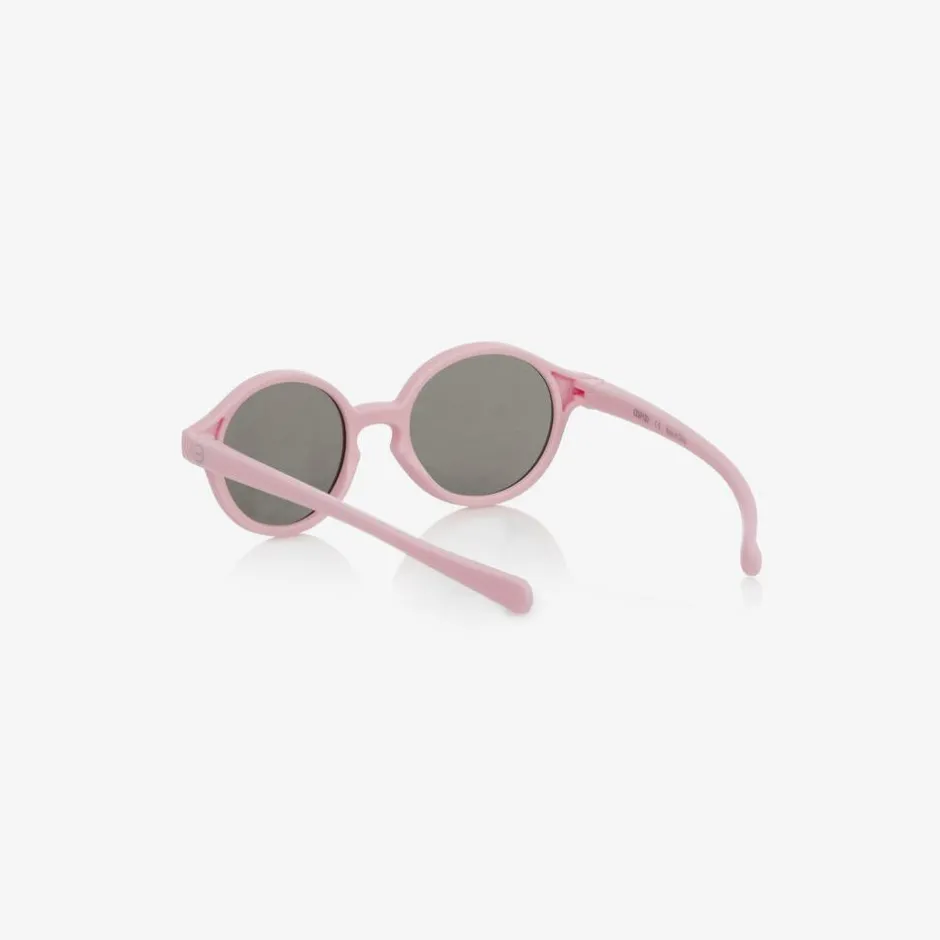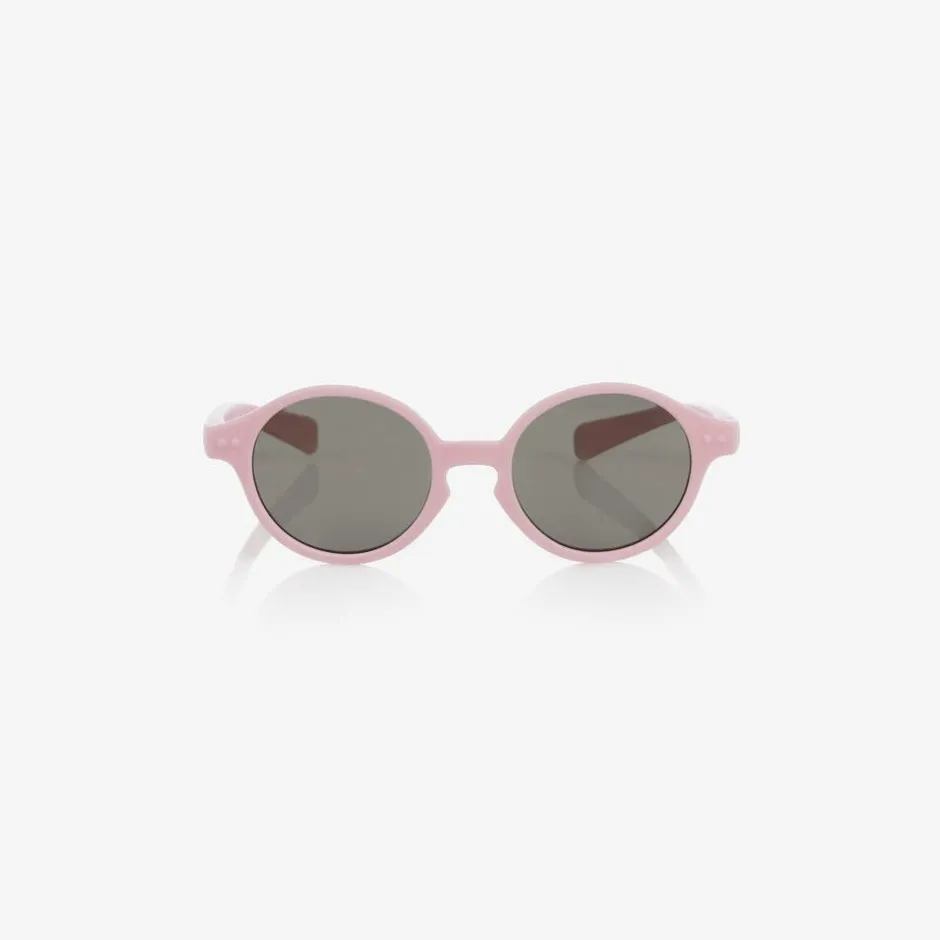 Pink sunglasses for younger girls, by IZIPIZI. The 100% UV protective grey lenses are polarised and have a category 3 filter offering protection against bright sunlight. They have matte yellow plastic frames and smaller sizes come with a detachable yellow silicone strap to help keep them in place on your little one's head.