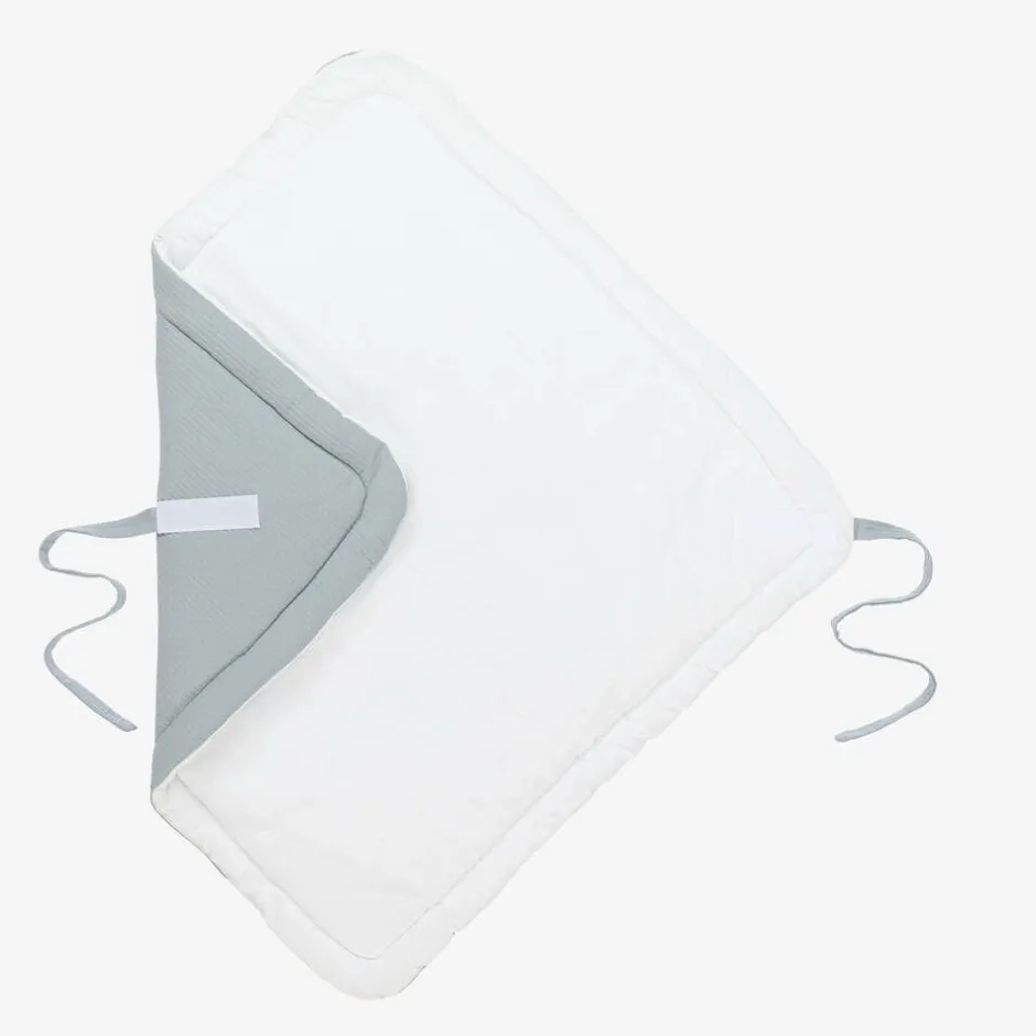 Grey-blue nest for baby boys and girls from Jamiks. Made in soft cotton with a lovely basket-weave pattern, it is lightly padded for comfort and has a contrasting white cotton lining. Beautifully simple in its design, the sleeping bag has a cross-over style with velcro fastening and a tie to secure in a bow. It can be opened flat to be used as a changing mat or as a comfortable surface for tummy time.