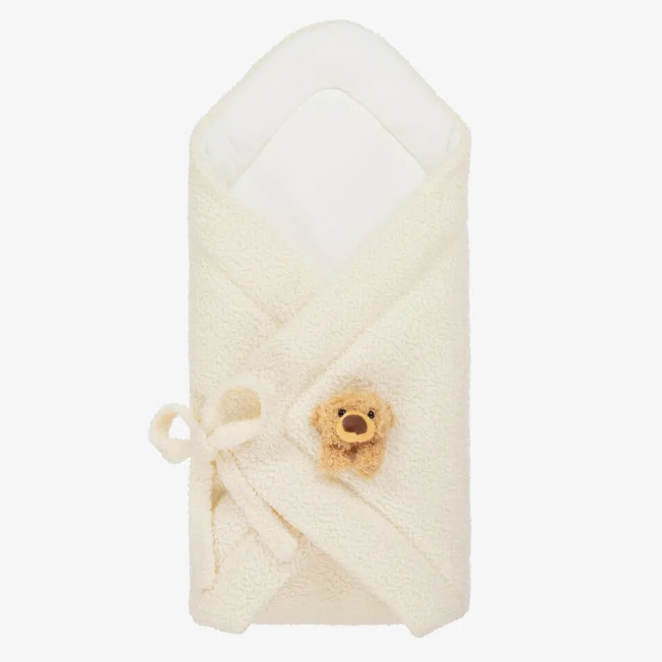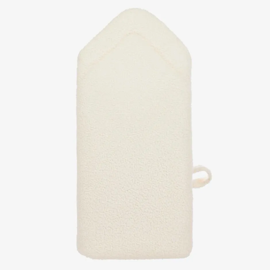 Cosy ivory nest for baby boys and girls by Jamiks, with a super cute teddy bear appliqué on the front. In a wrap-around style, it is made in warm bouclé fleece and secured with velcro and ties on one side. With mid-weight padding, it has a lightweight, organic cotton cheesecloth lining for comfort and can be opened out to be used as a soft surface on which to lay baby.