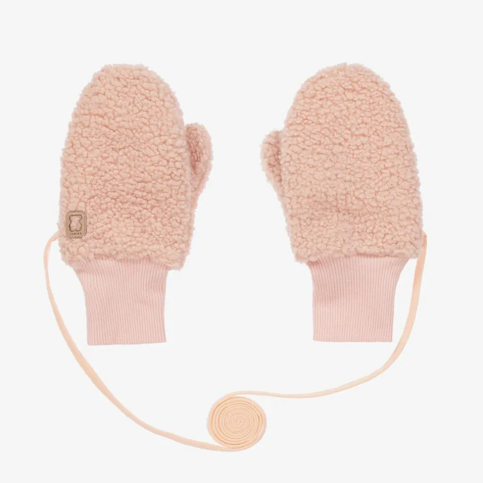 Pale pink mittens for girls from Jamiks, made in soft bouclé fleece. Lovely for those colder days, they have a cotton fleece lining for extra warmth and stretchy ribbed cuffs. The attached strap threads through the sleeves of their coat, to ensure the mittens do not get lost.