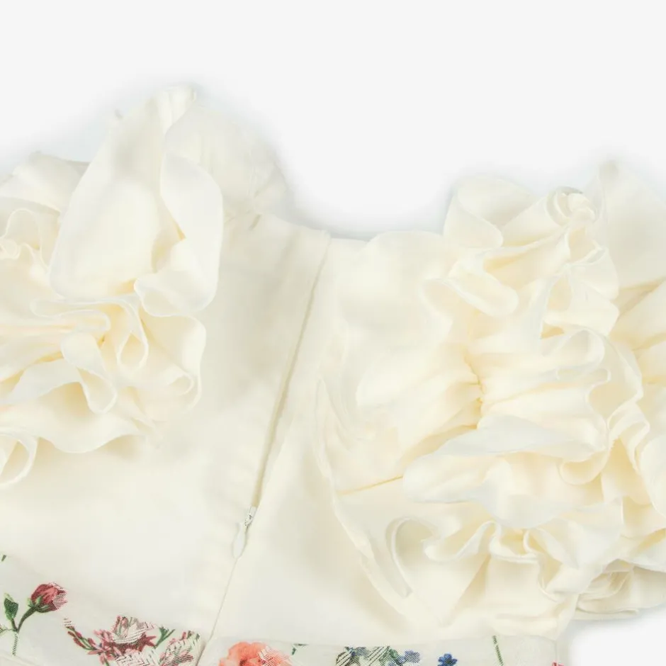 Exclusive to Childrensalon, a special occasion ivory dress for girls by British designer Jessie and James London. The cotton twill bodice has voluminous ruffled sleeves and the beautifully flared, floral jacquard skirt has a fixed belt detail with a metal logo tab. Comfortably lined in lightweight cotton, the dress fastens with a concealed zip and a button on the back.