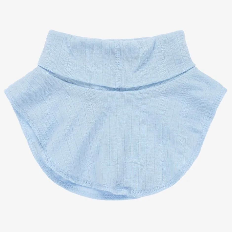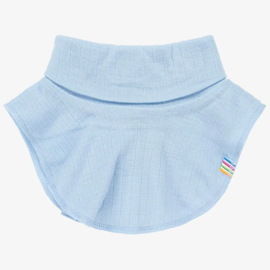 Super soft blue neck warmer for little boys and girls by Joha, made in fine Merino wool knitted jersey. Ideal for keeping little ones warm, it has a roll neck and a striped logo tab on the seam.