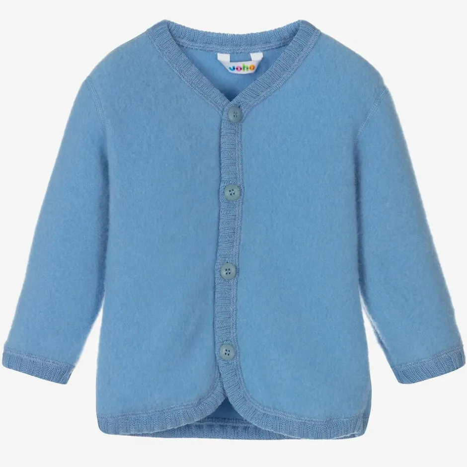 Blue thermal cardigan for little boys and girls, by Danish designer Joha. Expertly made in luxuriously soft and insulating Merino wool, this unisex cardigan has a rainbow striped logo on the side seam, and ribbed trims. Lovely for layering, it is designed to help regulate the body's temperature and keep your little one warm.