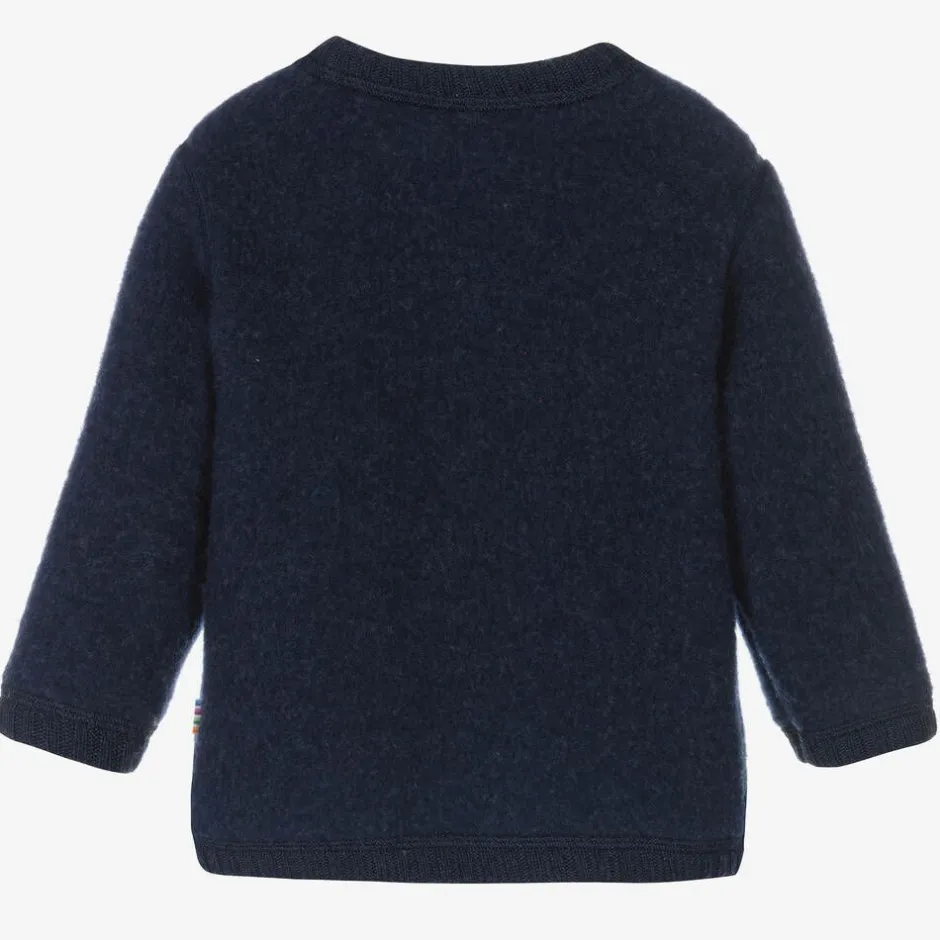 Navy blue thermal cardigan for little boys and girls, by Danish designer Joha. Expertly made in luxuriously soft and insulating Merino wool, this unisex cardigan has a rainbow striped logo on the side seam, and ribbed trims. Lovely for layering, it is designed to help regulate the body's temperature and keep your little one warm.