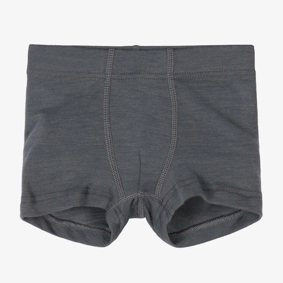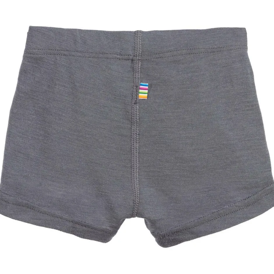 Grey thermal boxer shorts for boys by Joha, made from a luxurious Merino wool and silk blend. These comfortable boxers have an elasticated waistband and a striped rainbow logo tab stitched on the back seam.