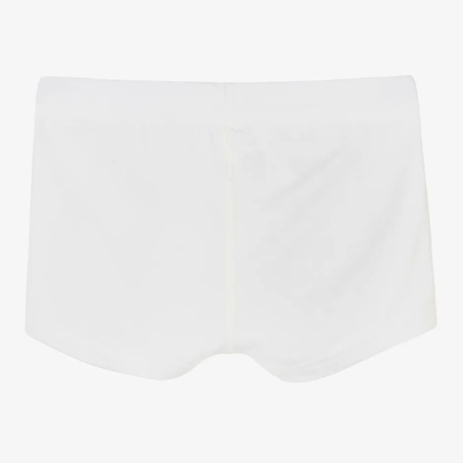 White thermal boxer shorts for boys by Joha, made from a luxurious organic viscose bamboo jersey. They have a comfortable elasticated waistband, with a striped rainbow logo tab on the front.