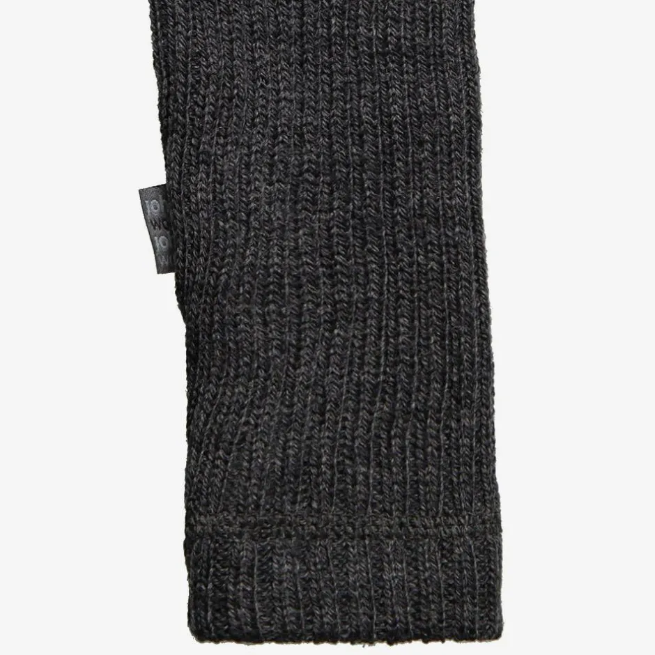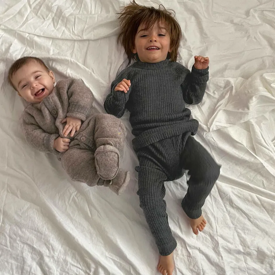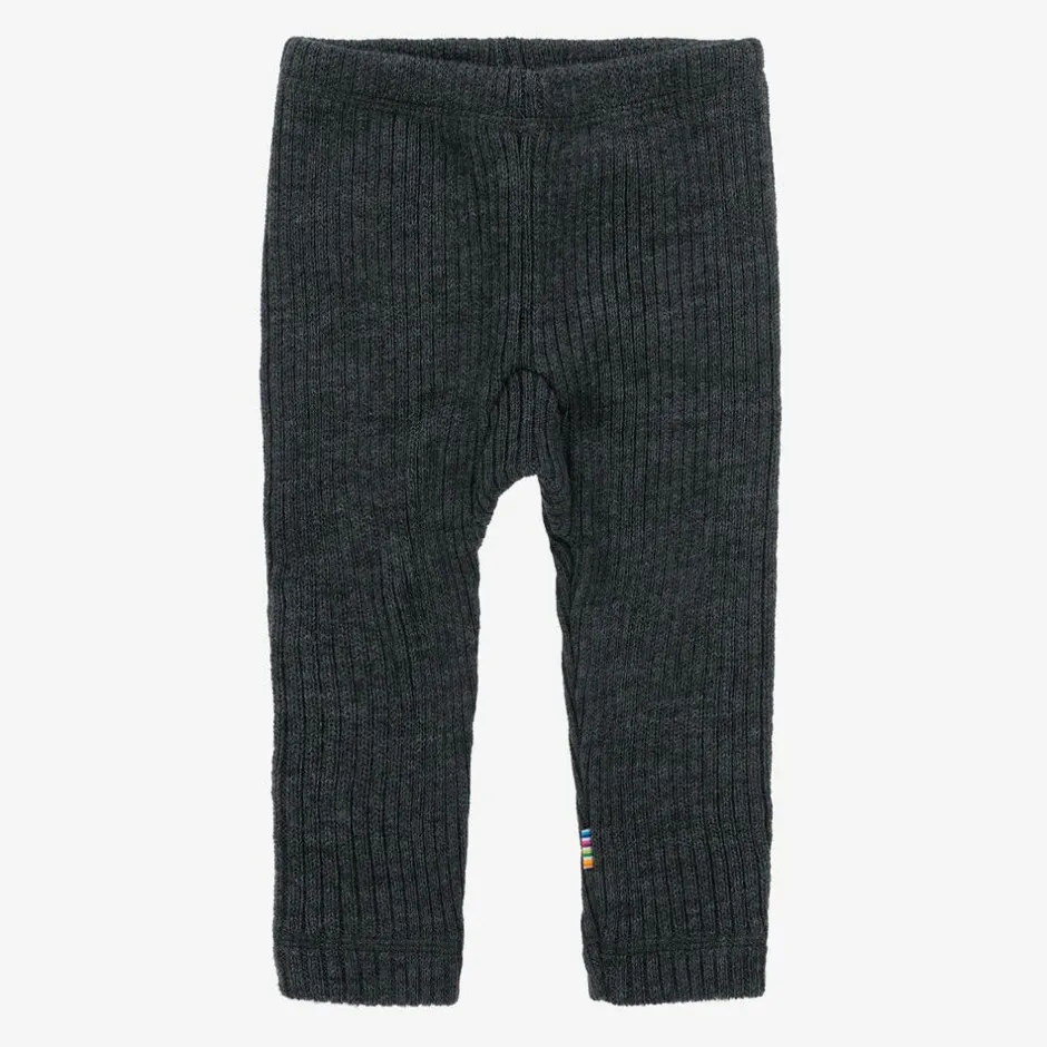 A pair of dark grey thermal leggings for little boys and girls by Joha, made in a beautifully soft, ribbed Merino wool. Cosy and warm, they are ideal as an extra layer when the weather turns colder, or they can be worn as comfortable leggings. The waistband is gently elasticated for comfort and there is a striped logo tab stitched on one side seam.