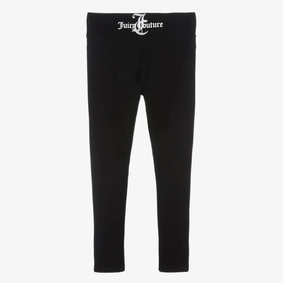 Black full-length leggings for girls by Juicy Couture. Made in soft cotton jersey, it has a statement logo print on the back of the wide waistband and a monogram on the front in glittery prints for a touch of glam.