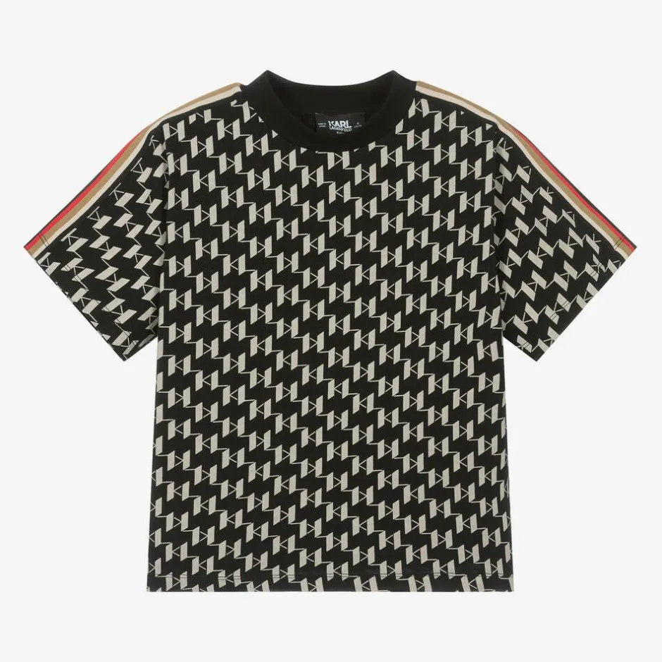 Cool, stand-out black cotton T-shirt for boys by KARL LAGERFELD KIDS, patterned with the brand's KL monogram in beige. Made in comfortable jersey, it has a ribbed neckline and taping along the shoulders and short sleeves, striped in red, beige, ivory and black.
