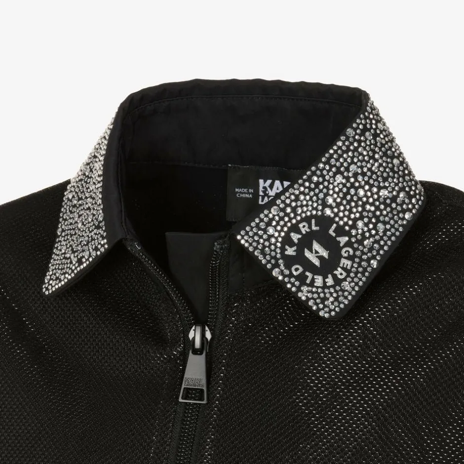 Smooth and sparkly with a lightweight lining, this black long-sleeved zip-up top for girls is by KARL LAGERFELD KIDS. Fastening with a tonal zip on the front, it has a diamanté-embellished pointed collar featuring a silver glittery logo design on one side. Ideal for a casual yet shimmery look, it has ivory and black striped mesh trims on the cuffs and the hemline for a sports luxe look.