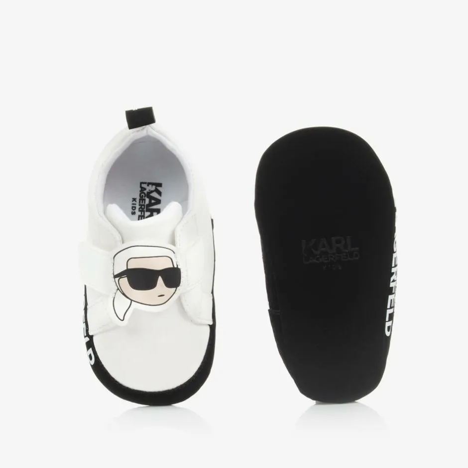 White pre-walker trainers for baby boys and girls by KARL LAGERFELD KIDS. They are made in soft faux leather, with branded midsoles pull tabs in contrasting black. Lined in comfortable textile, these cute shoes have smooth soles and fasten with an Ikonik Karl logo velcro strap.